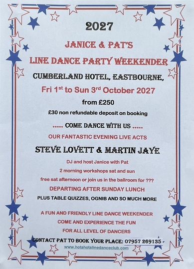 2026 LINE DANCE WEEKENDERS in Feb at the Grand Atlantic Hotel, Weston Super Mare and the Cumberland Halloween weekender in Oct are both fully booked. We have a waiting list for both of the weekends. Have a word with Pat to put your name down on the waiting list. As they say 'don't delay book today'
